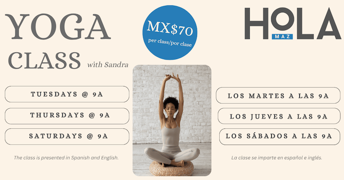 HoLA Maz 5 de Mayo 1602, Mazatlán, Sinaloa, MexicoRegular yoga practice. No rsvp needed. All levels welcome! Drop-in rate: MX$70 Monthly rate: MX$500 members / MX$600 general public