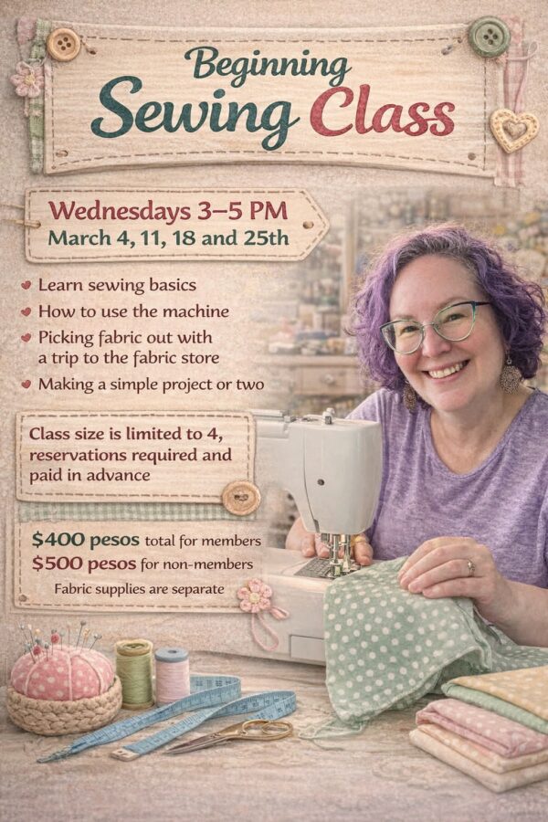 Learn the basics of sewing from an accomplished sewist in our crafting corner. This is a four session class on four consecutive Wednesday afternoons March 4, 11, 18, and 25 MX$400 for members \ MX$500 for non-members **Fabric supplies not included**